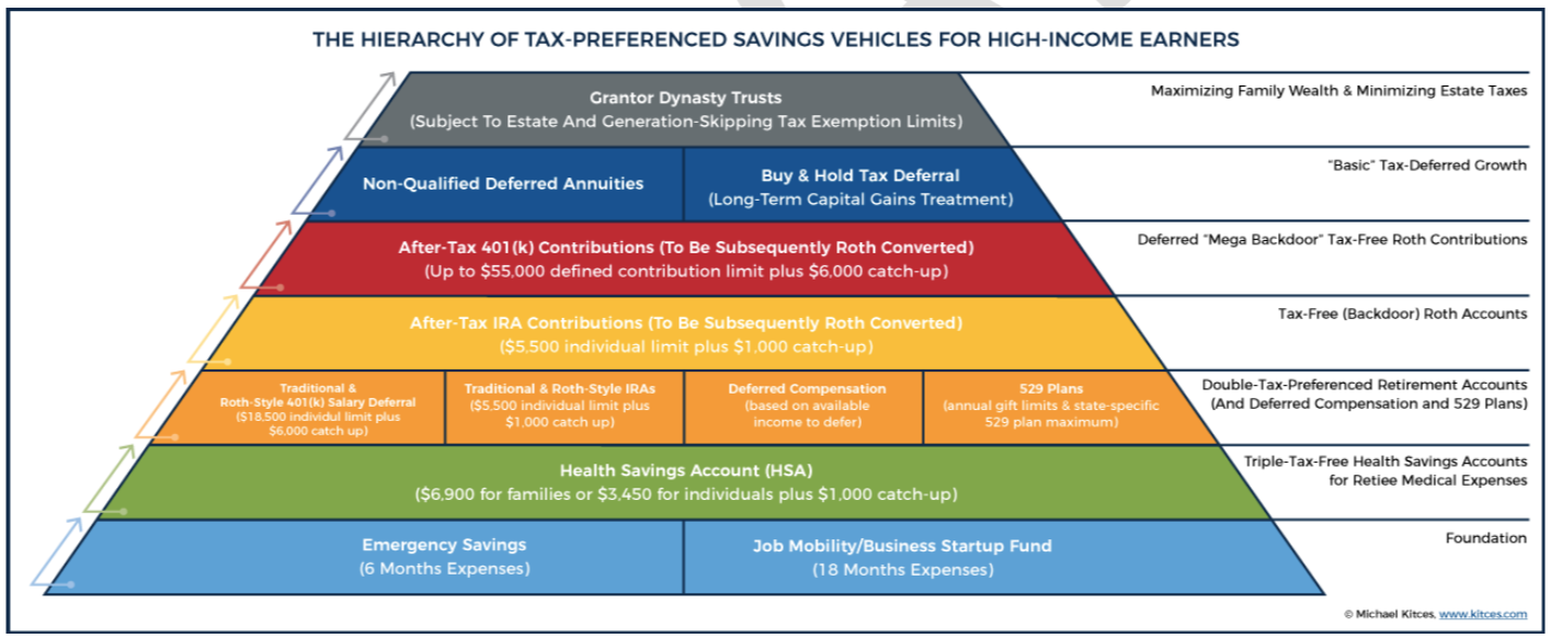 This article was inspired by The Hierarchy of Tax-Preferenced Savings Vehicles for High-Income Earners, by Michael Kitces.