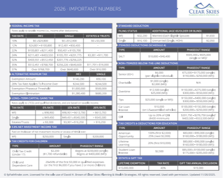 Important Tax NumbersThere are lots of important numbers that Clear Skies Planning & Wealth keeps in mind. In some cases, the numbers are annual limits that change each year. Other times, the figures do not often change, but are used by many of our clients. Given the variety of sources that report relevant numbers, it can be difficult to quickly find the right figure(s) you are looking for.
